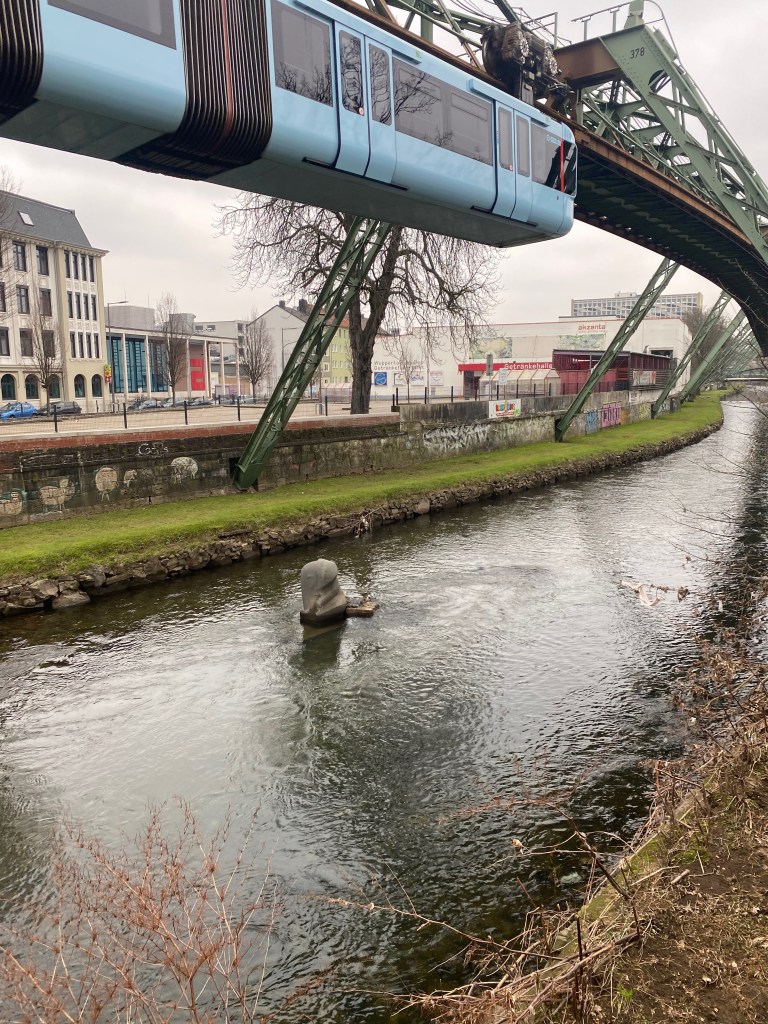 Schon als Kind kannte ich die Geschichte von Tuffi, der jungen Elefantendame, die in den 1950-er Jahren in der Schwebebahn befördert wurde. Während der Fahrt bekam sie Panik, trat eine Seitenwand ein und fiel etwa 12 m tief in die Wupper. Sie überlebte den Sturz. An dieser Stelle befindet sich heute zur Erinnerung eine Tuffi aus Beton.