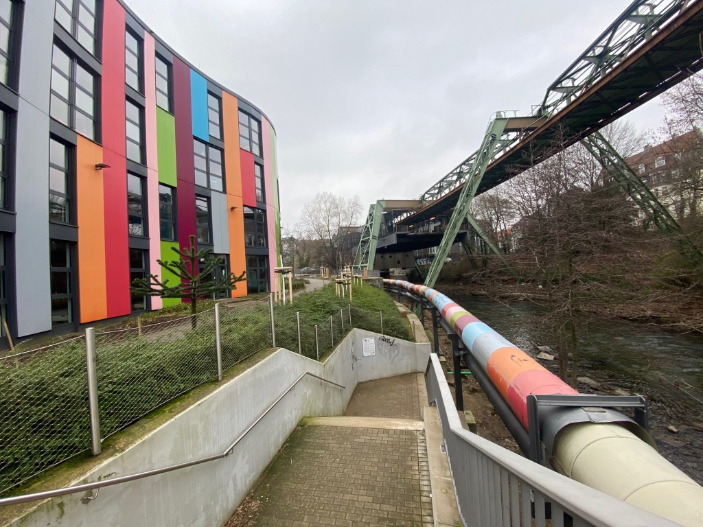 In den ersten Minuten war es merkwürdig, die etwa 13 km zu schweben. Zunächst führt die Linie über Straßen entlang. Das Schienenkonstrukt erinnert uns an den EL in Chicago. Der größte Teil der Strecke führt allerdings über dem Flusslauf der Wupper entlang.